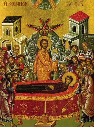 In giving birth you retained your virginity, and in dormition you did not forsake the world, O Theotokos. You were translated unto life, being the Mother of Life. And thus by virtue of your intercessions you deliver our souls from death. (Apolytkion of the Dormition of the Theotokos, First Tone, Trans. by Fr. Seraphim Dedes)